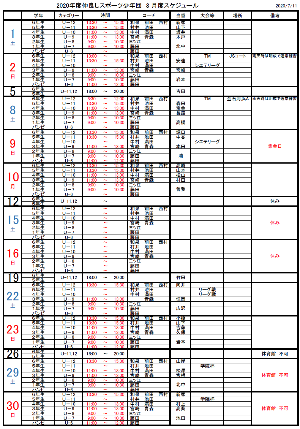 メンバーページからも過去のスケジュール表がダウンロードできます。 2025年12月 2025年11月 2025年10月 ■スケジュールの訂正 2020/08/23(日) U-9 AM TM@田鶴浜多目的グラウンド 2020/08/29(土) U-10 太白台交流戦 2020/08/30(日) U-10 太白台交流戦