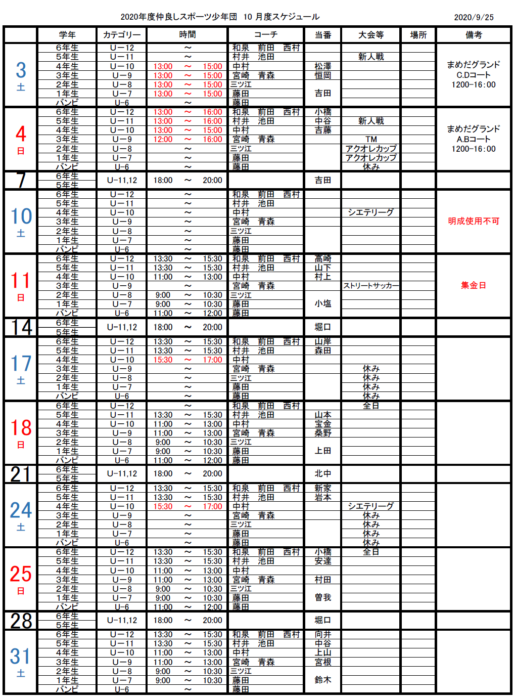 2020/10/10(土) U-11/9/8/7 お休み