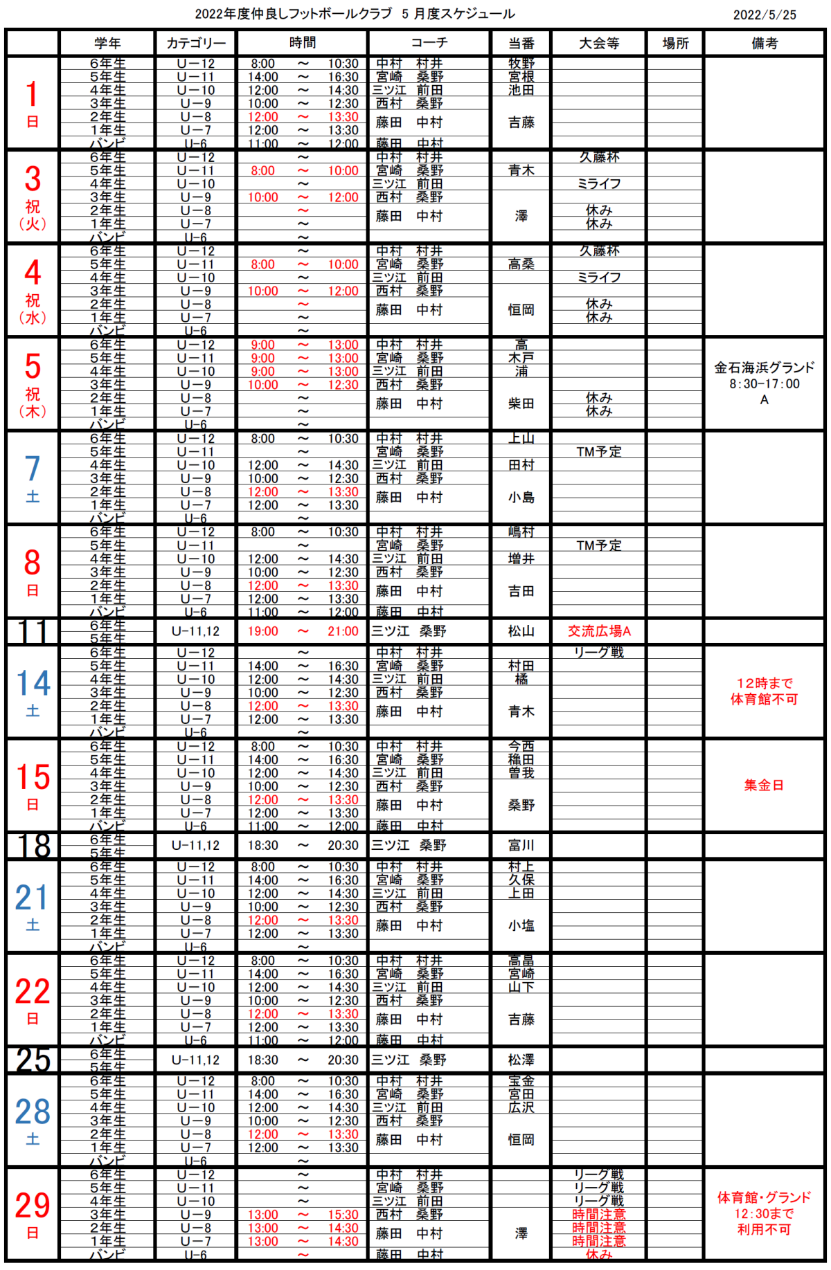 メンバーページからも過去のスケジュール表がダウンロードできます。 2025年12月 2025年11月 2025年10月 ■スケジュールの訂正 5/21 U-10 シエテリーグ 5/22 U-9 1 DAY CUP 5/28 U-8 シエテリーグ