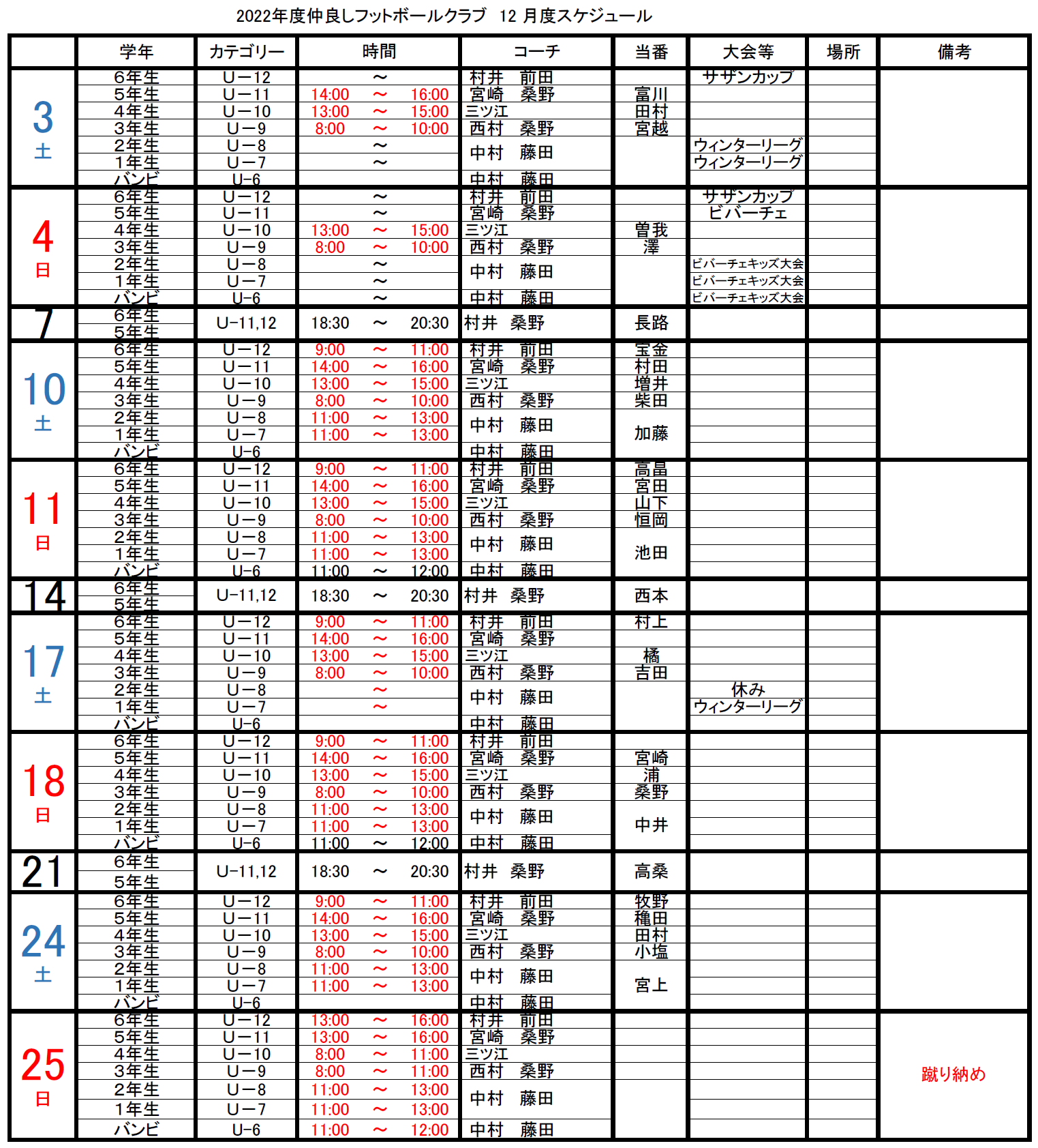メンバーページからも過去のスケジュール表がダウンロードできます。 2025年12月 2025年11月 2025年10月 ■スケジュールの訂正 12/17 U-11 川北フットサル 12/18 U-12 川北フットサル