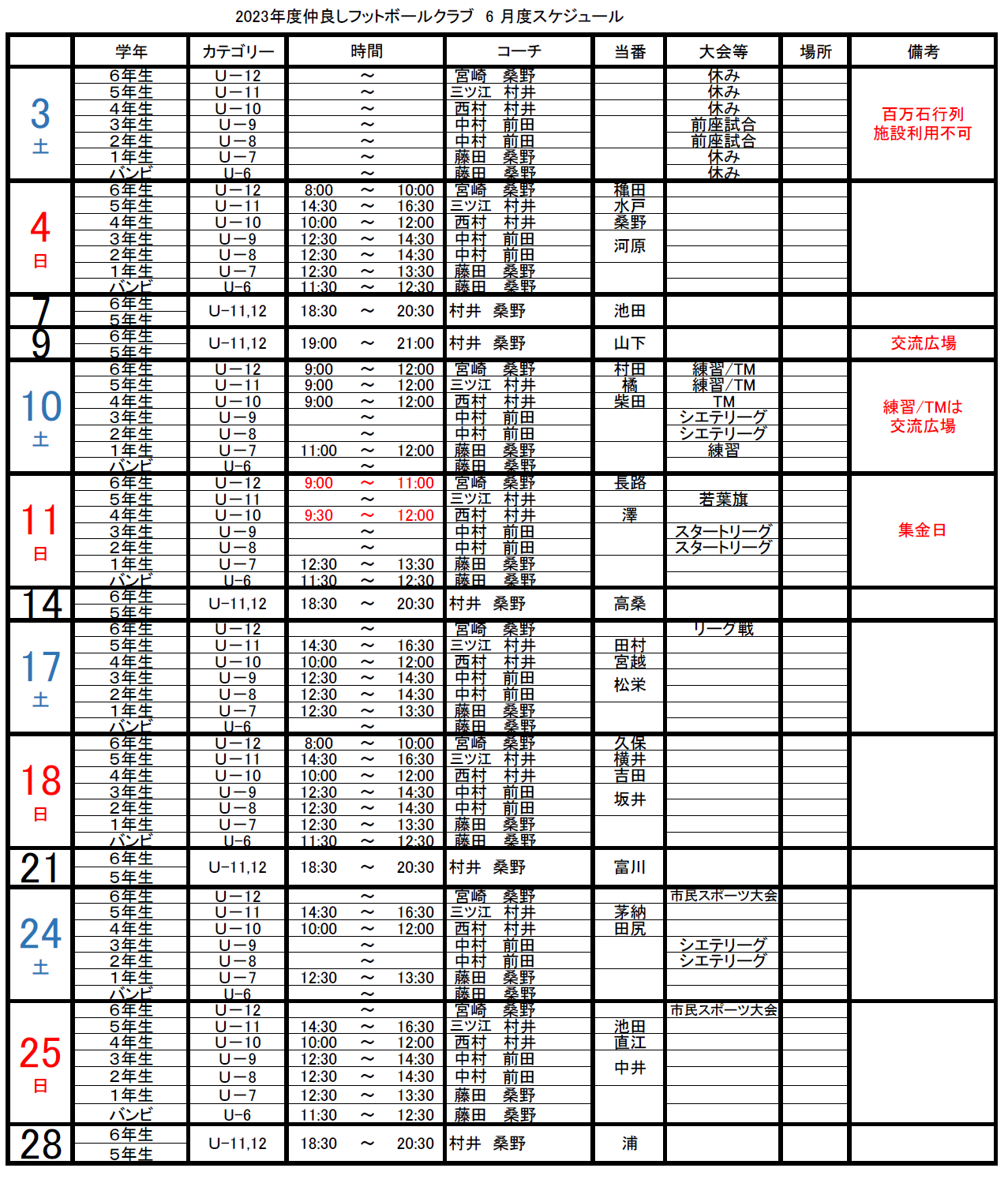 メンバーページからも過去のスケジュール表がダウンロードできます。 2025年12月 2025年11月 2025年10月 ■スケジュールの訂正 6/4 U-12 TM 6/10 U-12/11/10/7 8:30-13:00(※U-7のみ11:00-12:00) TM 6/18 U-10 TM 6/24 U-10 TM