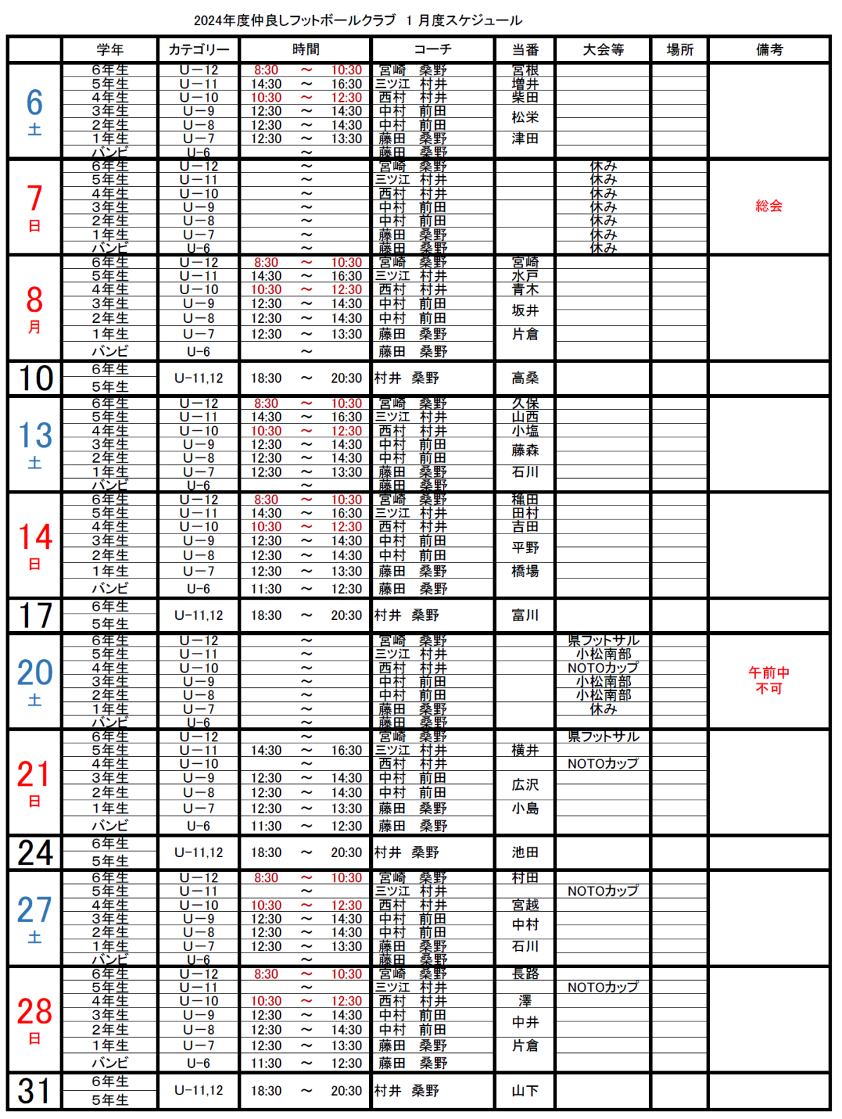 U-7 通常練習時間変更(~3月末) 12:30~14:30