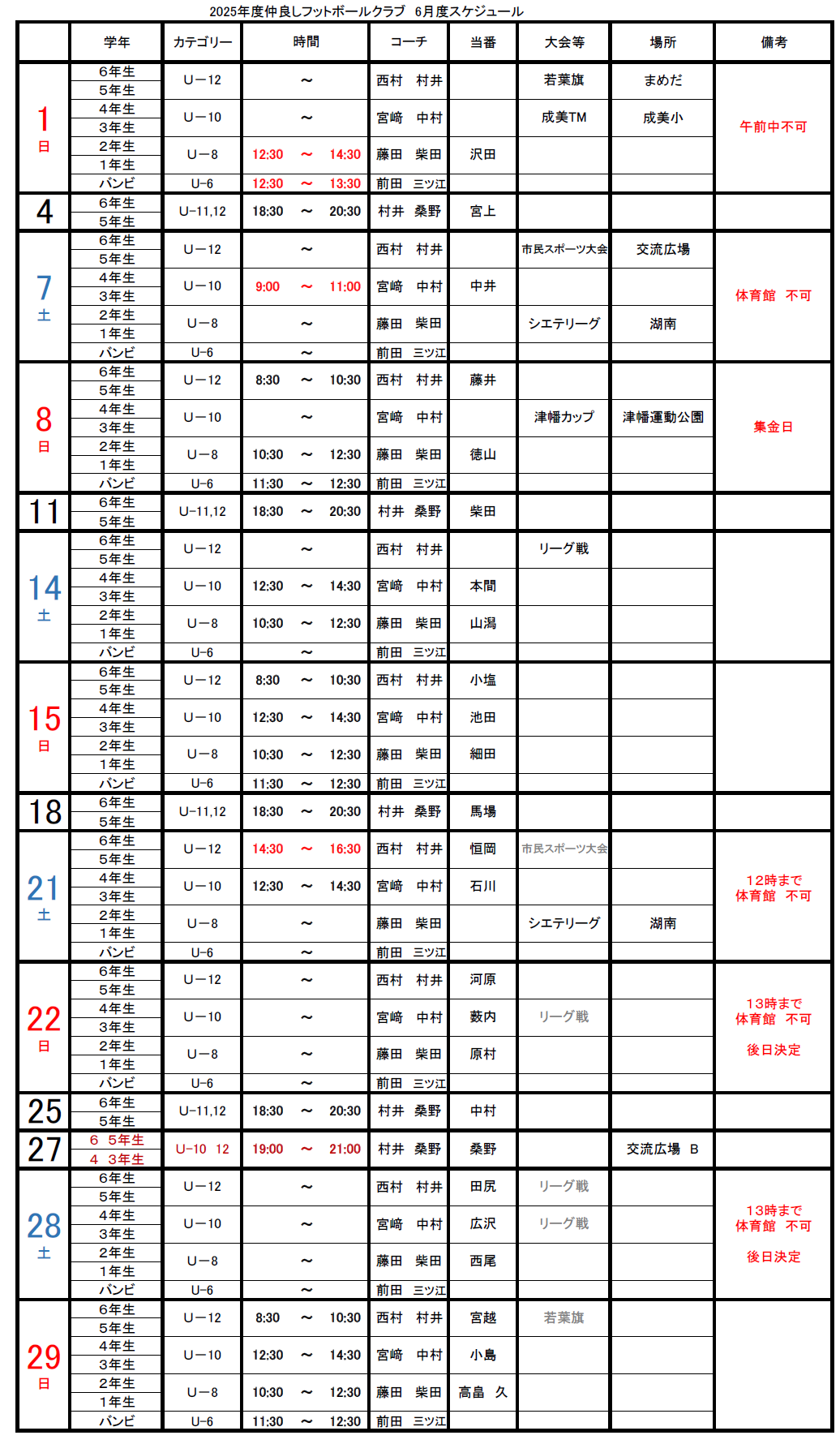 メンバーページからも過去のスケジュール表がダウンロードできます。 2025年12月 2025年11月 2025年10月 ■スケジュールの訂正 6/22(土) 雨天時:U-12/10 14:30-16:30、U-8 13:00-15:00、U-6 13:00-14:00(晴天時は通常の時間帯) 6/28(日) U-12 14:30-16:30、U-8 13:00-15:00